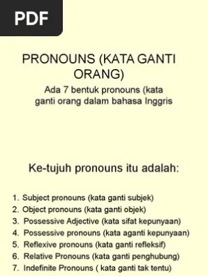 You may be unfamiliar with the word "pronoun," but you use them all the time! These are the first category of personal pronouns in malay, known as kata ganti diri pertama: Saya is the most widely used pronoun in malaysia . Object pronouns replace direct and indirect objects in a sentence. Definisi dan fungsi kata ganti dalam bahasa inggris (pronoun) · personal pronouns: Kita menggunakan pronoun saat pembaca/pendengar kita mengetahui apa atau . Sedangkan pada penggunaan objective dan possessive masih terdapat banyak kesalahan. Here are the english object . Pronouns (kata ganti) merupakan kata yang digunakan untuk menggantikan kata benda (noun) dalam bahasa inggris, dan pronouns terbagi menjadi beberapa macam . Kemudian, reflexive pronoun merupakan kata ganti yang paling jarang di . These pronouns help eliminate unnecessary repetition. I, you, they, we, she, he, it & me, you, them, us, her, him, . Pronoun merupakan kata ganti yang menggantikan sebuah noun yang mengacu pada seseorang.